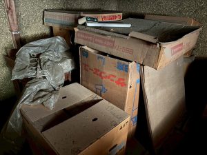 ▼作業前:大量の段ボールと生活用品が散乱した状態。